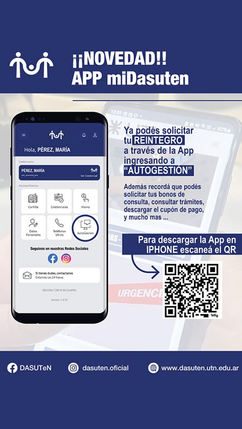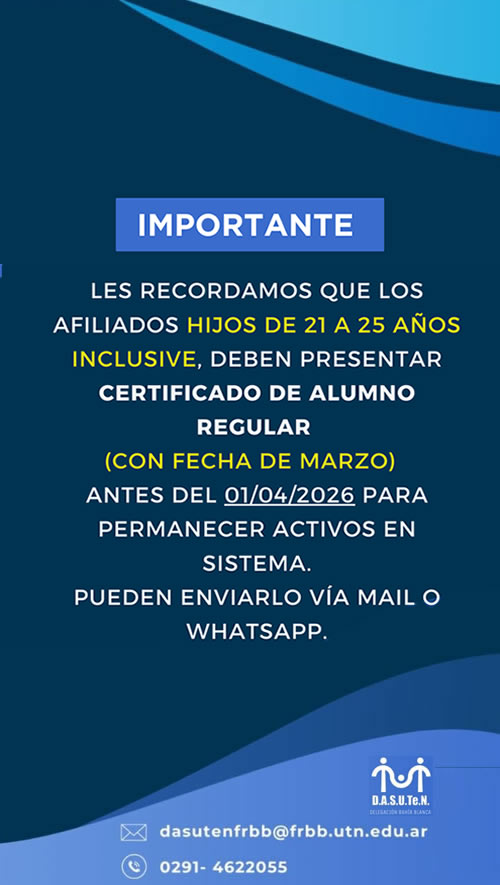 La Dirección de Acción Social de la Universidad Tecnológica Nacional (DASUTeN) fue creada el 9 de Agosto de 1991, bajo la misión de brindar el máximo nivel de cobertura médico asistencial y social, para la totalidad de los empleados, contratados, graduados y jubilados que pertenecen a la UTN, como así también a los integrantes de su grupo familiar.